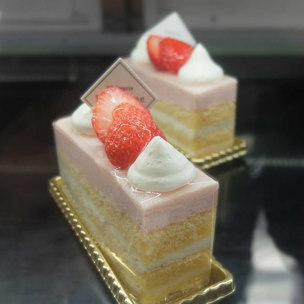 春のラ・ポンムのショーケースにはやわらかい色のケーキが並びます。